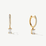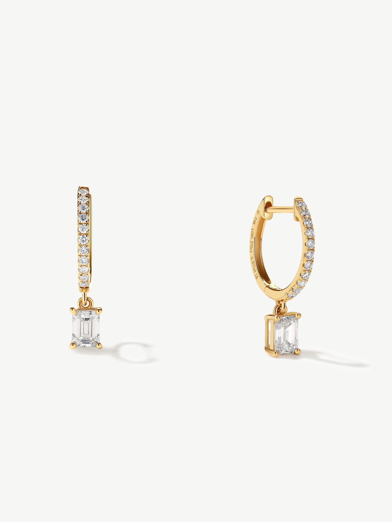 "Emerald Grace" transforms the classic round hoop into a refined statement of elegance. Paved with shimmering diamonds, the hoops provide a radiant frame that highlights the beauty of a dangling emerald-cut stone suspended beneath each hoop.