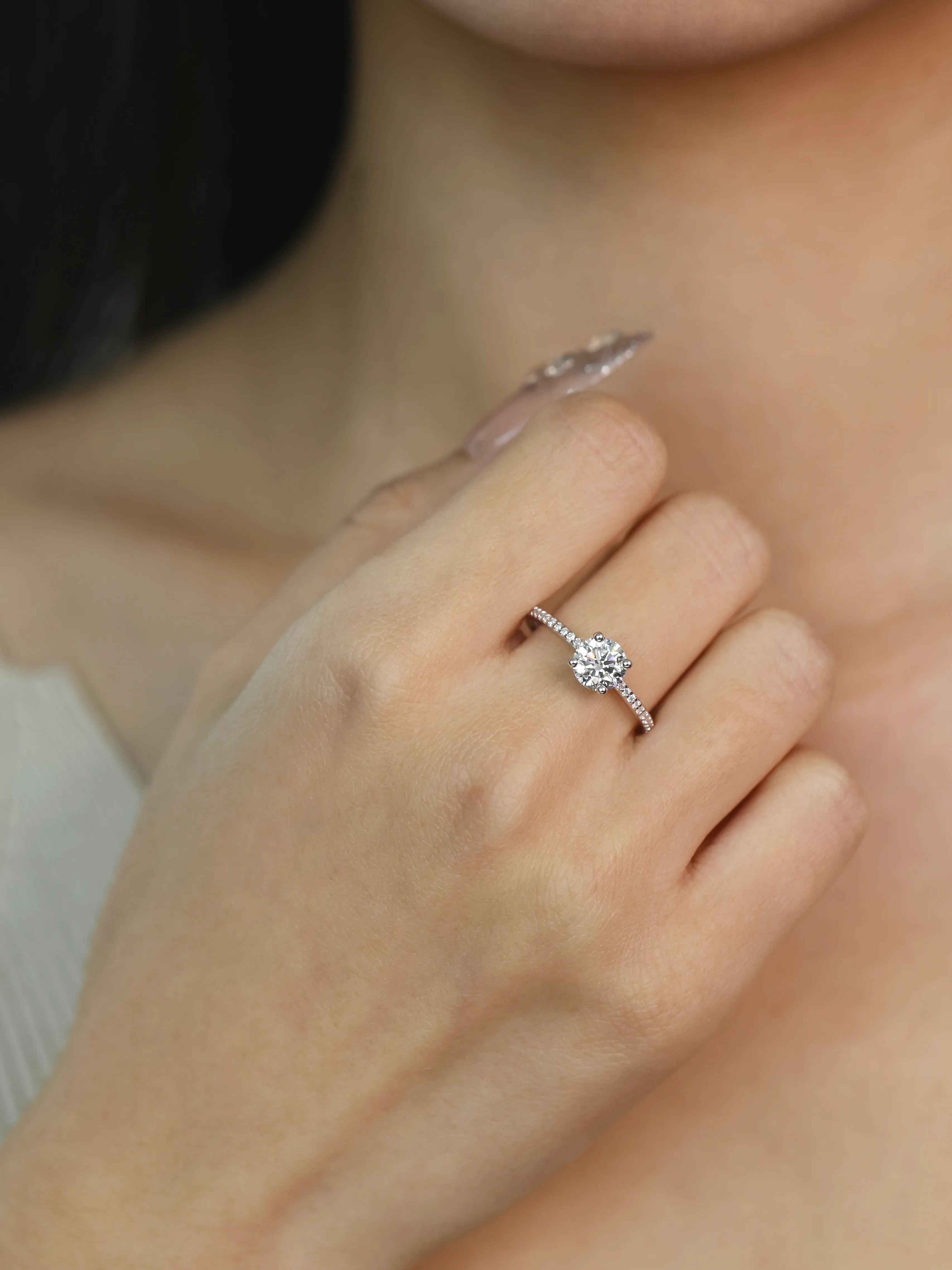 "Vows in Brilliance" is a dazzling tribute to the promises made and the light they bring to life. This classic engagement ring showcases a stunning lab-grown diamond in a timeless four-prong setting, allowing the center stone to shine with unparalleled brilliance.