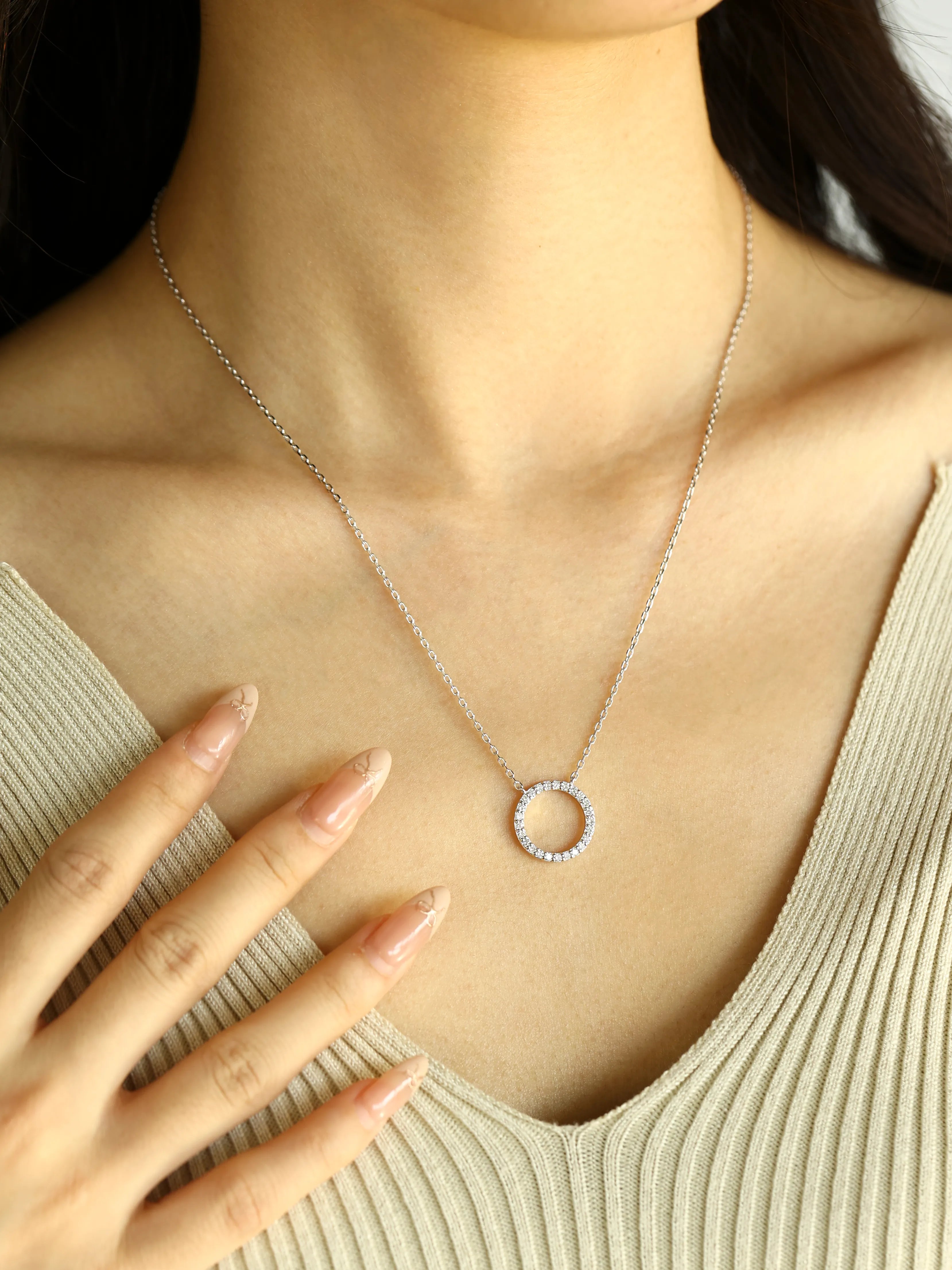 "Circle of Light" transforms the classic round pendant into a radiant symbol of unity and brilliance. Micro-paved with lab-grown diamonds, the delicate design creates an unbroken flow of light, representing the beauty of infinite connections and timeless elegance.