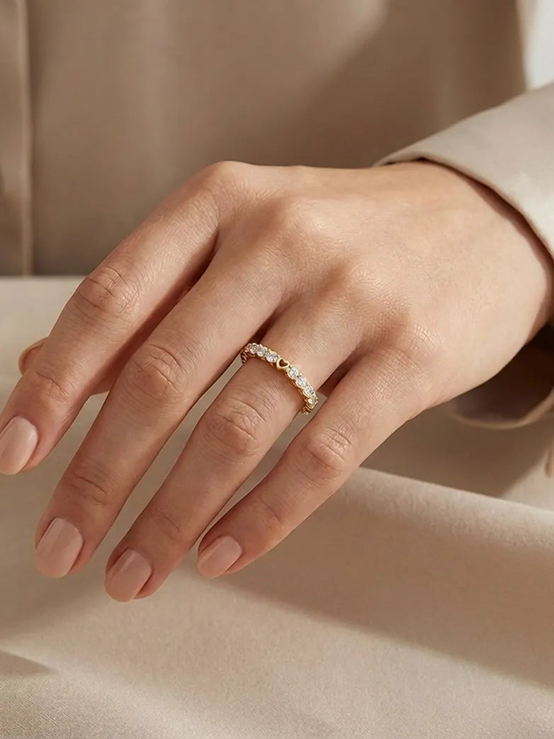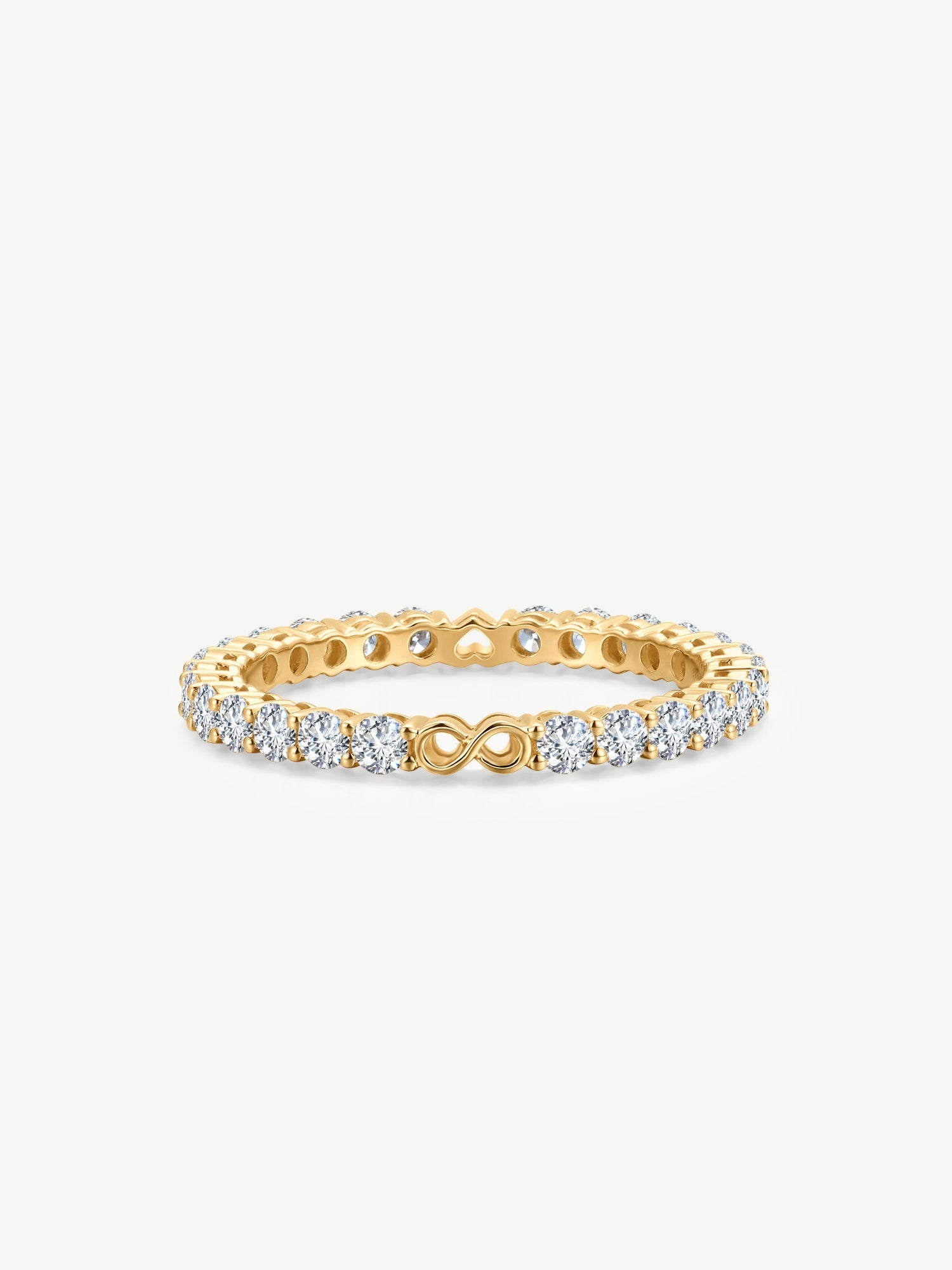 The design is elevated by a delicate infinity symbol seamlessly integrated into the band, adding a layer of profound meaning to its classic beauty. Look closer to find a charming hidden heart detail in the gallery, making it a perfect gift for anniversaries, engagements, or as a sophisticated addition to your everyday stack.