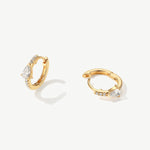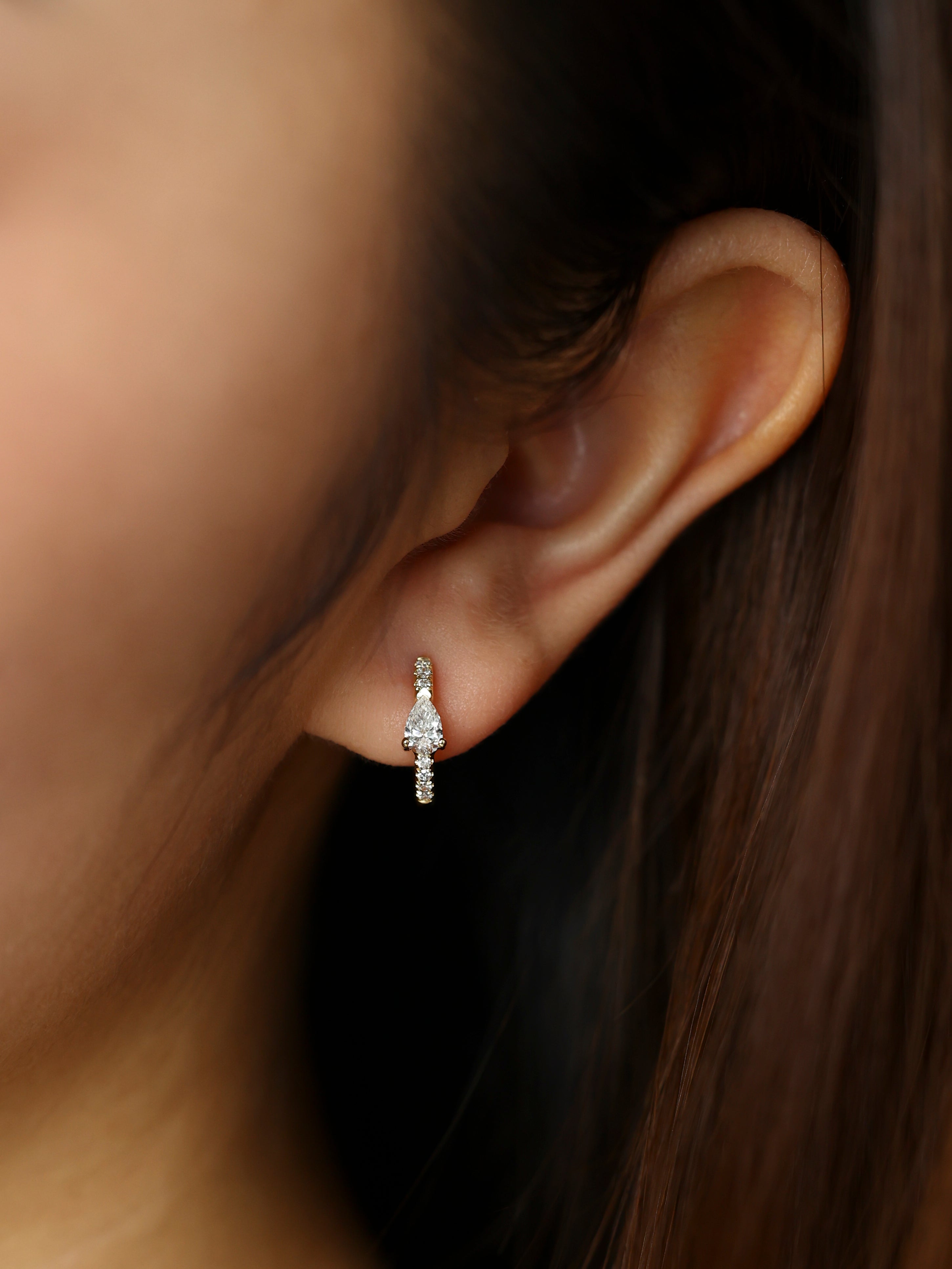 Our "Radiance Embraced" captures the harmonious blend of classic luxury and contemporary sophistication. These huggie hoop earrings are paved with a dazzling array of small diamonds for a luxurious finish. At the heart of the design, a pear-shaped diamond (0.19ct on each side) takes center stage, its graceful silhouette embodying the elegance of refined artistry.
