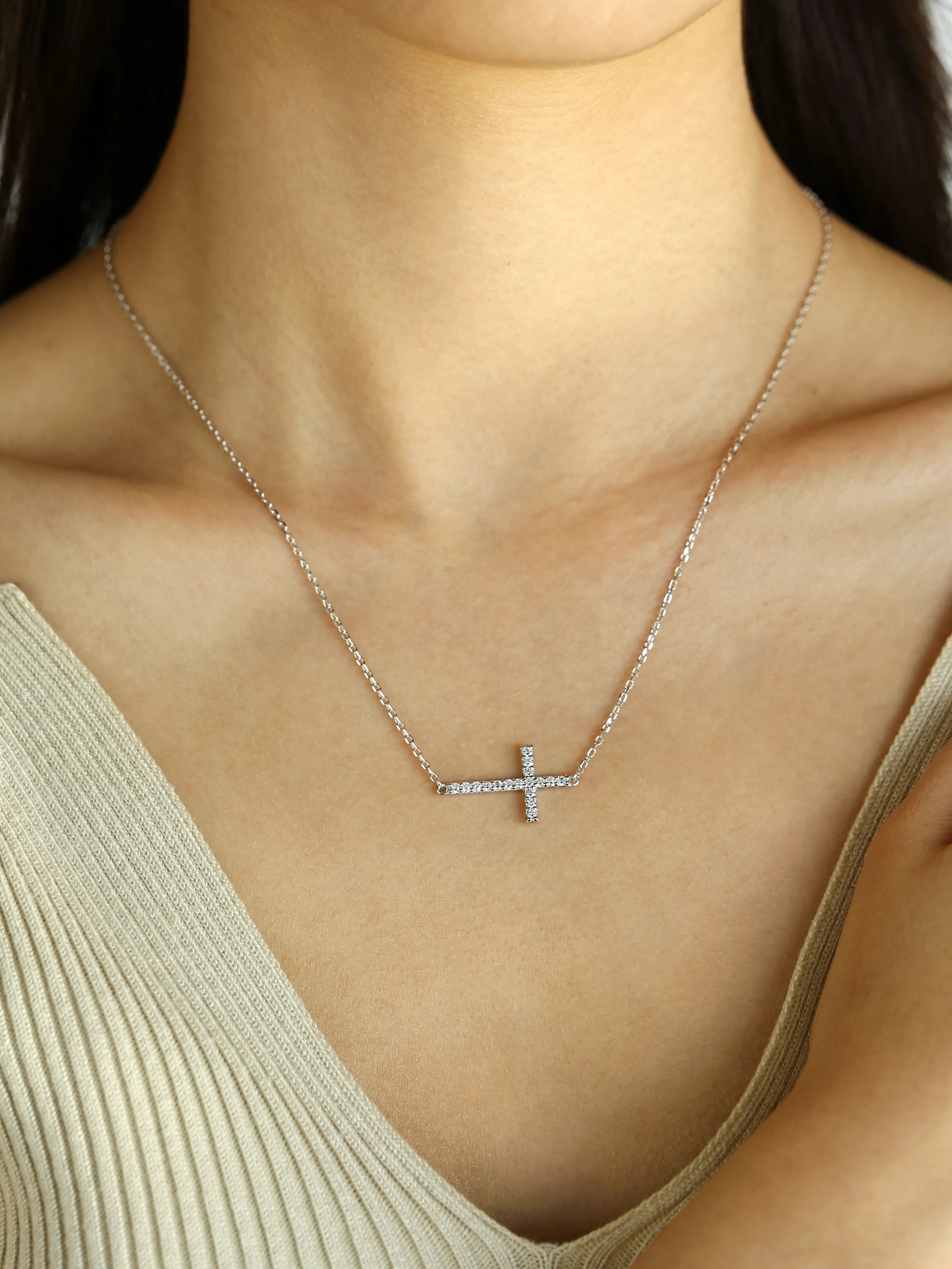 "Crossroads of Light" reimagines the traditional cross necklace with a sleek, sideways design. Suspended horizontally, this contemporary piece symbolizes the intersection of paths and the light that guides us through life’s journey.