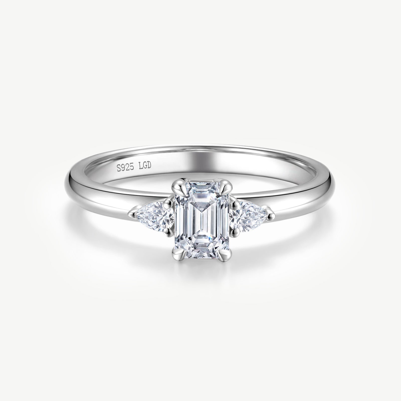 Three Stone Emerald Cut Lab Grown Diamond Engagement Ring in Sterling Silver
