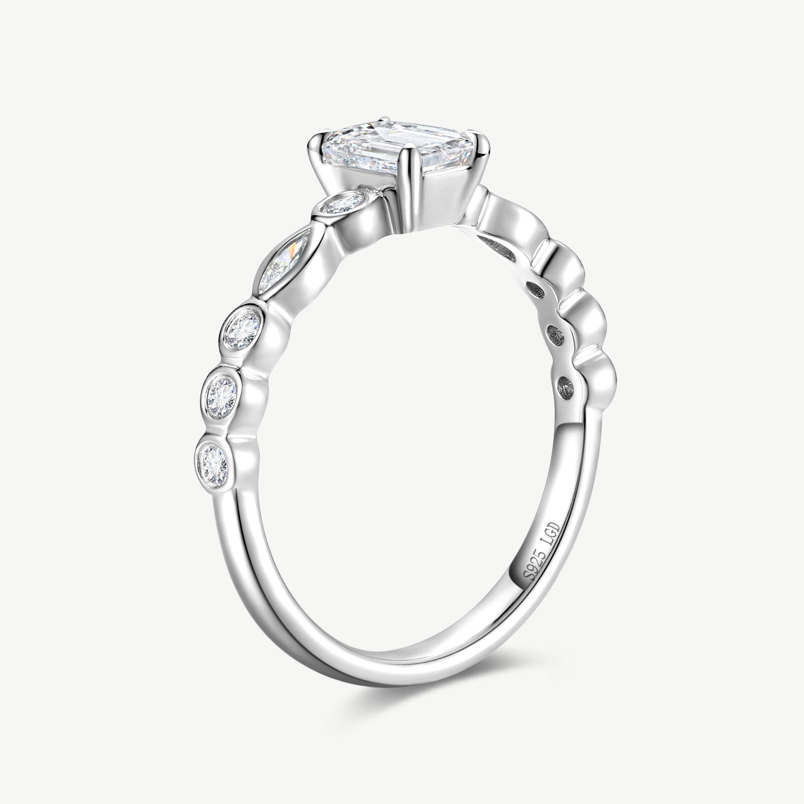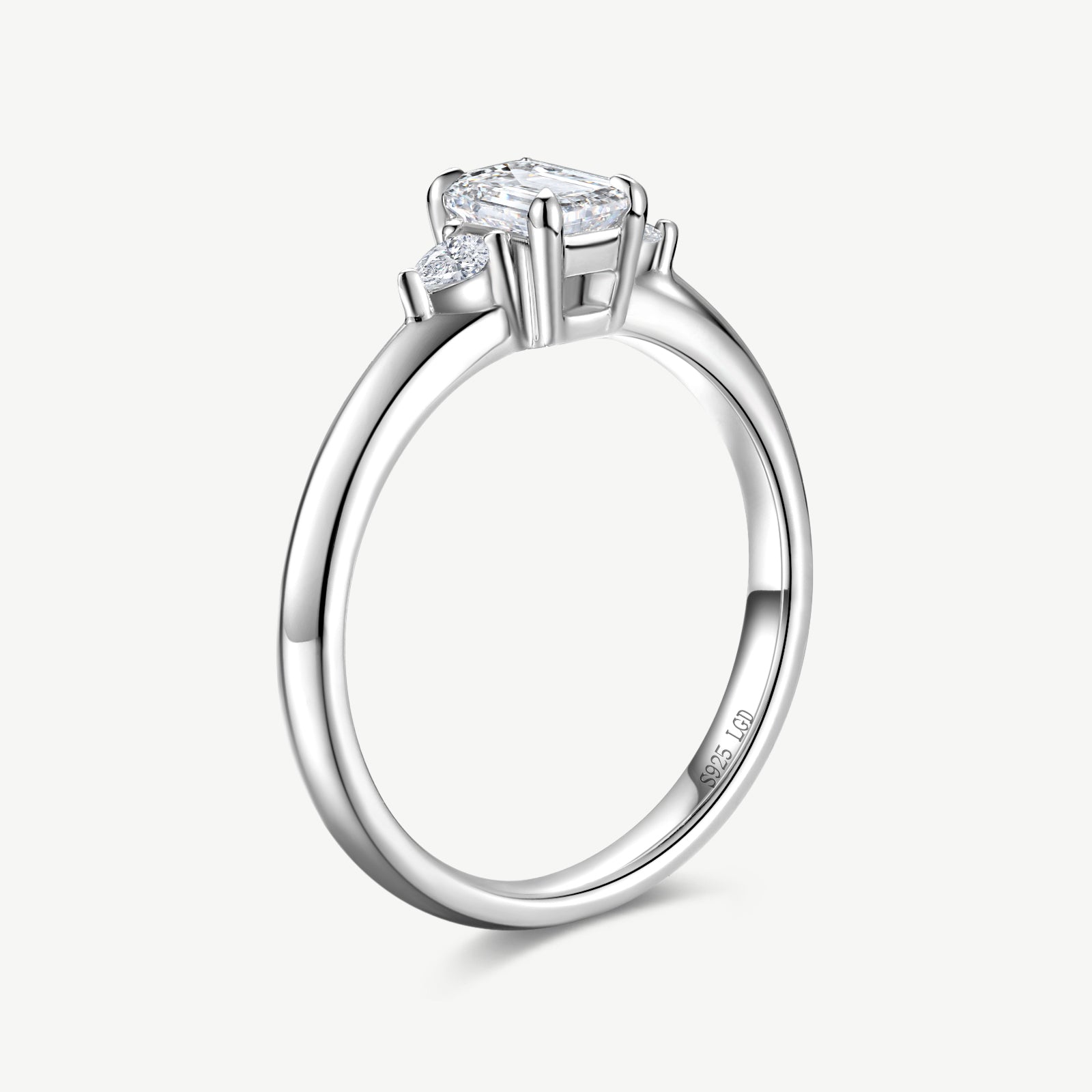 Emerald Cut Lab Grown Diamond Side Stone Engagement Ring in Sterling Silver
