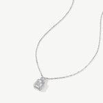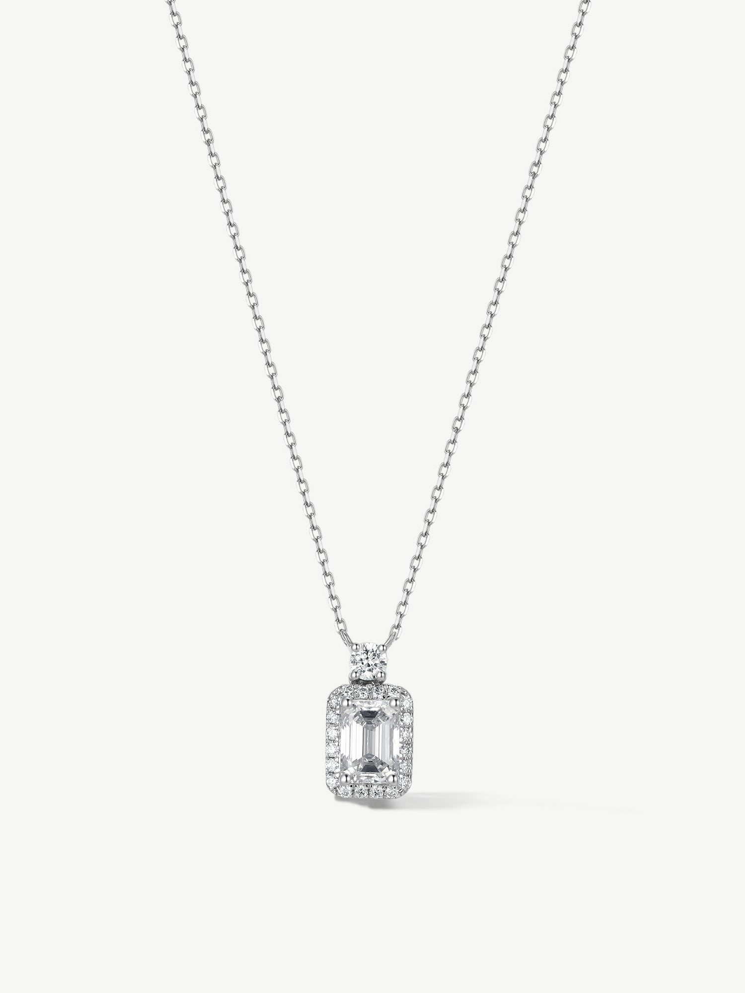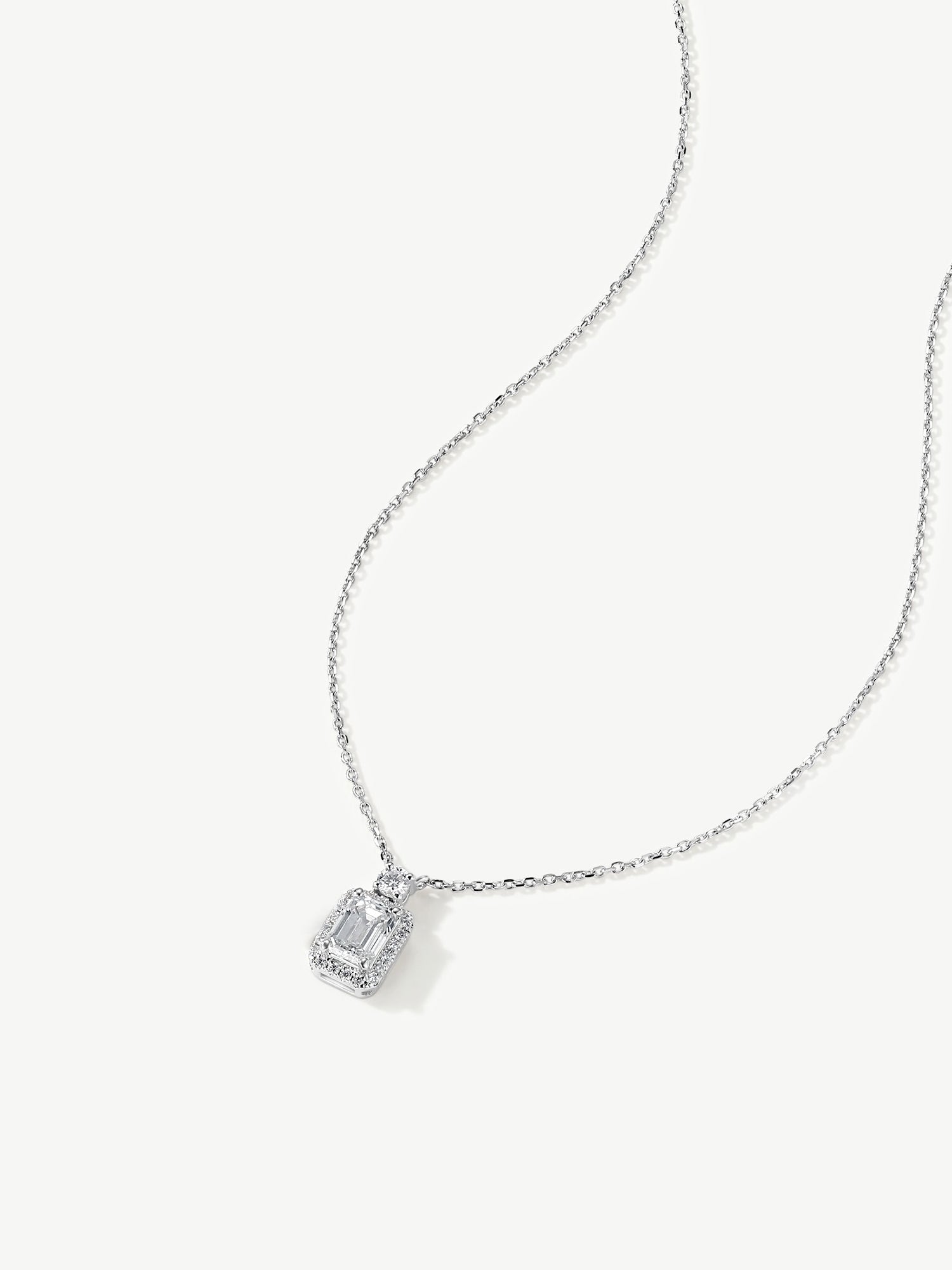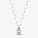 A tribute to clarity and inner strength, this pendant features a luminous emerald-cut diamond framed in a soft halo of brilliance. Topped with a single round diamond, it symbolizes the light that guides your path—refined, radiant, and quietly powerful.